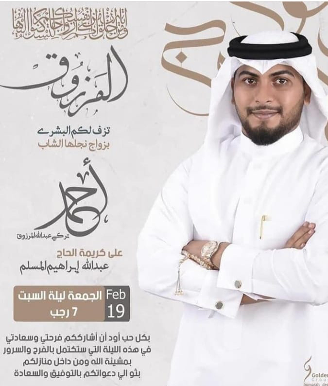 تحتفل عائلة المرزوق والمسلم في سيهات مساء يوم الجمعة بزفاف الشاب أحمد تركي عبدالله المرزوق على كريمة الحاج عبدالله ابراهيم المسلم وسط فرحة الأهل والأصدقاء ومحبي العريسين.
