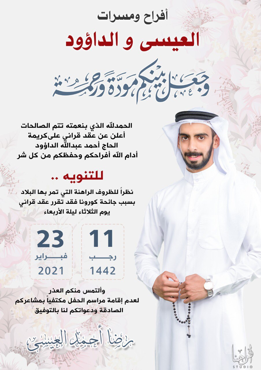 احتفلت عائلة العيسى والداؤود في صفوى مساء يوم الثلاثاء بعقد قران الشاب رضا أحمد العيسى على كريمة الحاج أحمد عبدالله الداؤود وسط فرحة الأهل والأصدقاء ومحبي العريسين.