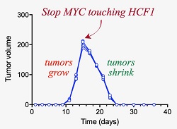 الشكل: التجربة التي اجريت أظهرت ستة أحجام للورم نمت في مدة 15 يومًا، وعند هذه النقطة تم وقف تفاعل بروتين ال MYC-HCF1. بعد اليوم الخامس عشر، تقلصت الأورام السرطانية واختفت. الخلايا السرطانية ماتت في أربعة أيام. - وليام تانسي
