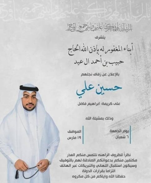 تحتفل عائلة آل عيد في سيهات مساء يوم الجمعة بزفاف الشاب حسين علي آل عيد وسط فرحة الأهل والأصدقاء ومحبي العريسين.