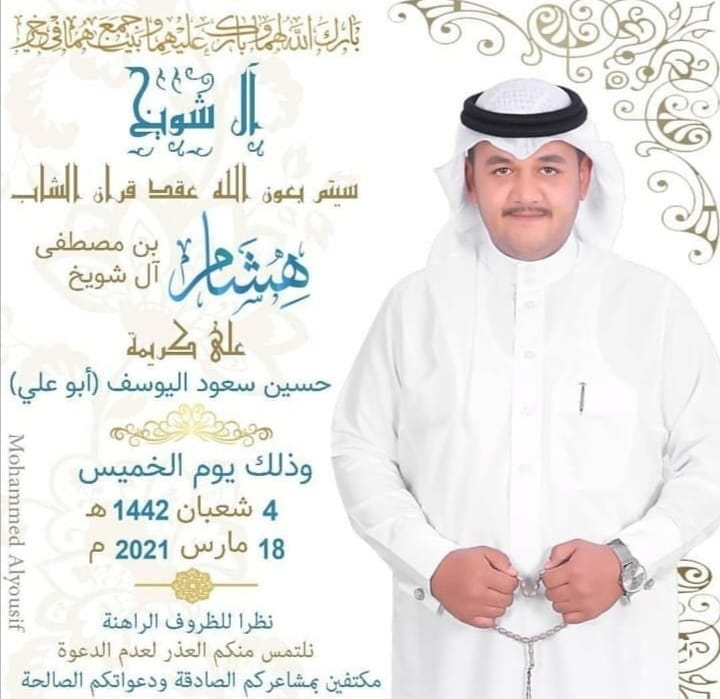 احتفلت عائلة آل شويخ واليوسف في سيهات مساء يوم الخميس بزفاف الشاب هشام مصطفى آل شويخ على كريمة الحاج حسين سعود اليوسف «أبو علي» وسط فرحة الأهل والأصدقاء ومحبي العريسين.