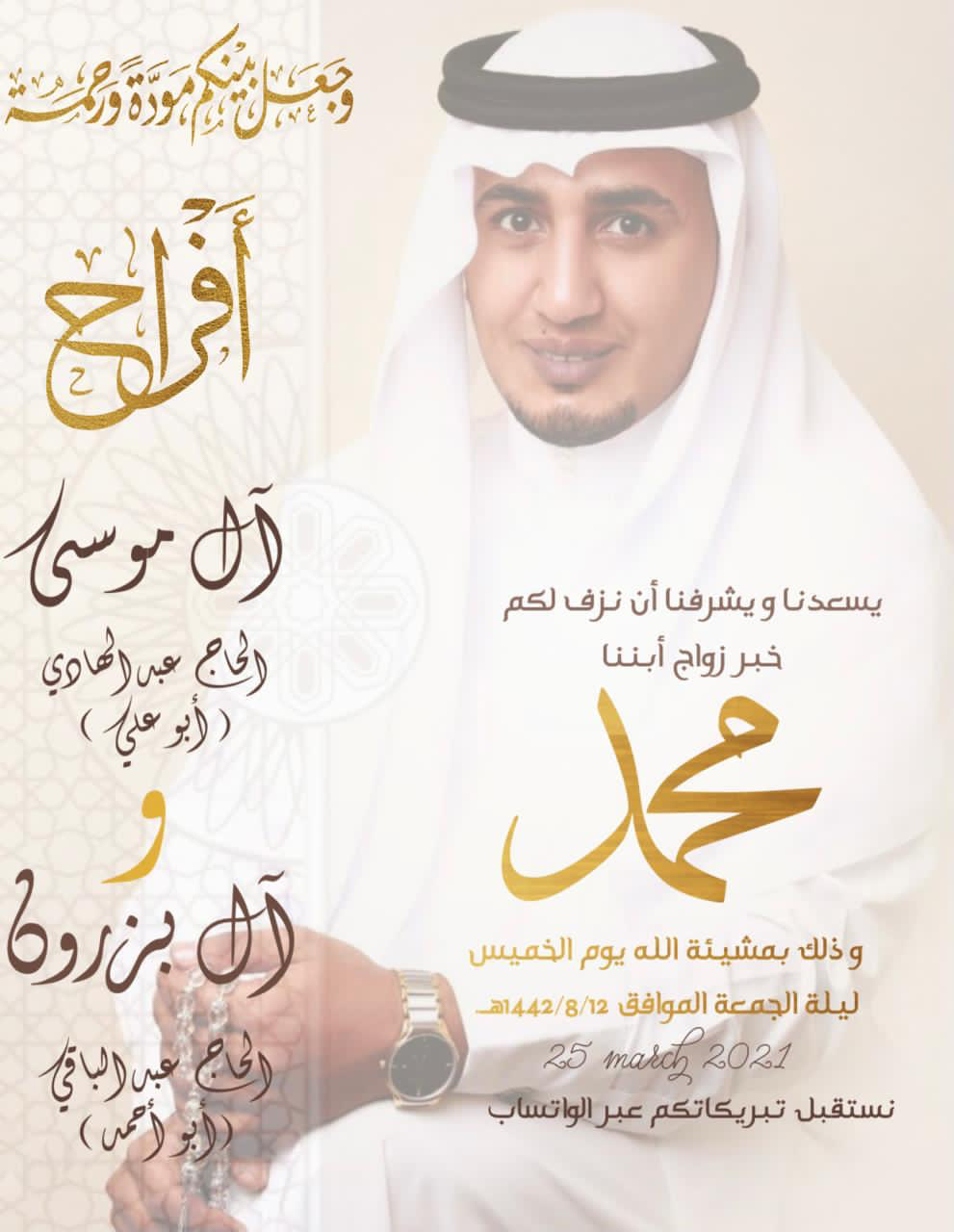 تحتفل عائلة آل موسى وآل بزرون في القطيف مساء يوم الخميس بزفاف الشاب محمد عبد الهادي علي آل موسى على كريمة الحاج عبد الباقي أحمد آل بزرون وسط فرحة الأهل والأصدقاء ومحبي العريسين.