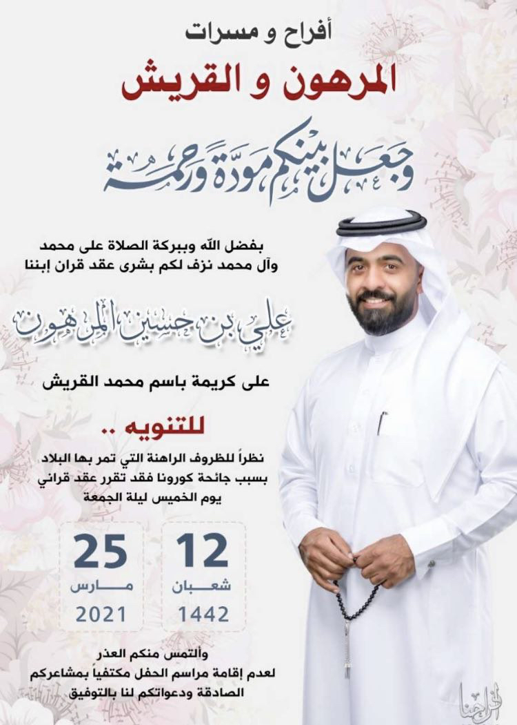 احتفلت عائلة المرهون والقريش في صفوى مساء يوم الخميس بعقد قران الشاب علي حسين المرهون على كريمة الحاج باسم محمد القريش وسط فرحة الأهل والأصدقاء ومحبي العريسين.