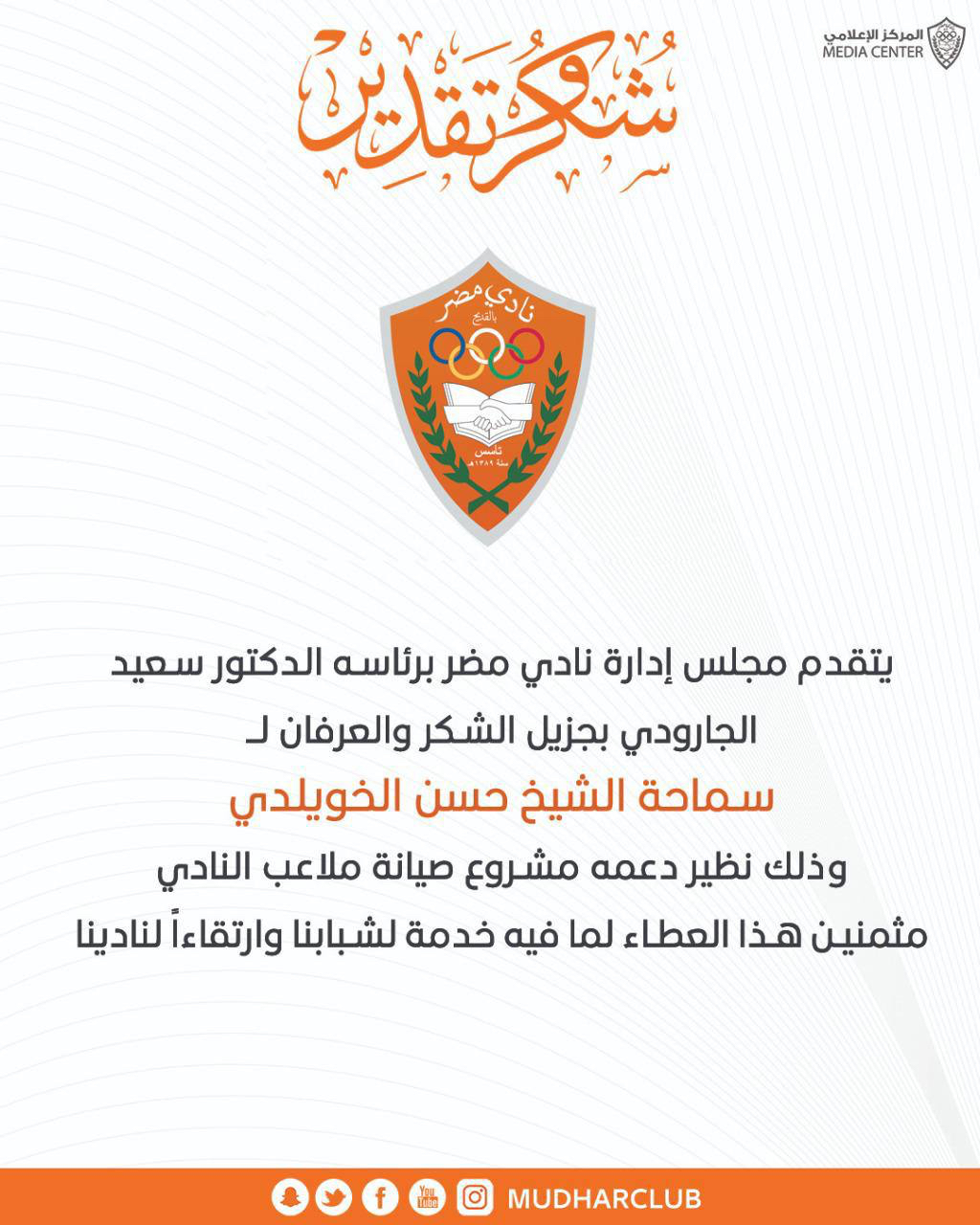 كرّمت إدارة نادي مضر الرياضي بالقديح برئاسة الدكتور سعيد الجارودي الشيخ حسن الخويلدي وذلك نظير دعمه مشروع صيانة ملاعب النادي.
