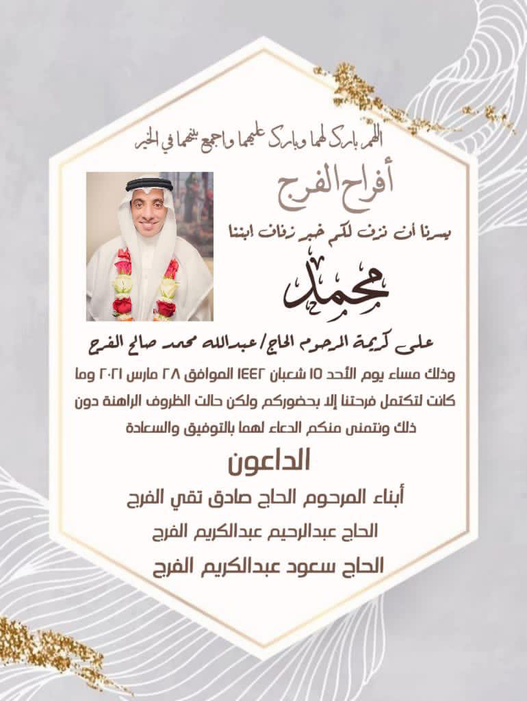 تحتفل عائلة الفرج في العوامية مساء يوم الأحد بزفاف الشاب محمد صادق تقي الفرج على كريمة المرحوم عبدالله محمد صالح الفرج وسط فرحة الأهل والأصدقاء ومحبي العريسين.