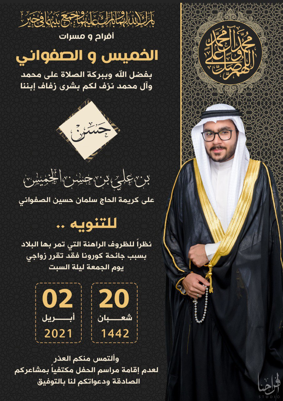 احتفلت عائلة الخميس والصفواني في صفوى مساء يوم الجمعة بزفاف الشاب حسن علي حسن الخميس على كريمة الحاج سلمان حسين الصفواني وسط فرحة الأهل والأصدقاء ومحبي العريسين.