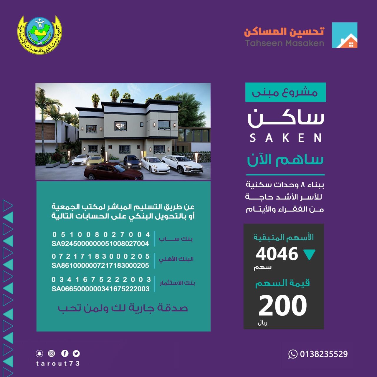 ونوه إلى ان إجمالي إيرادات مشروع ساكن التي جمعت من اهالي الخير والاحسان بلغت نحو: 1,160,581 ريال وان المبلغ المتبقي للمشروع هو: 839,419 ريالا.