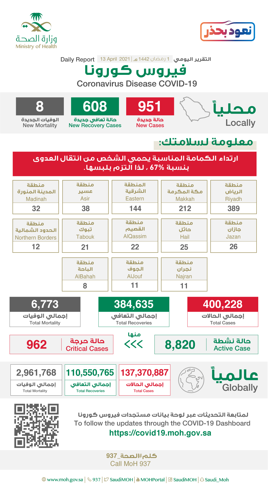 وبلغ إجمالي الحالات النشطة 8820 حالة، منها 962 حالة حرجة.