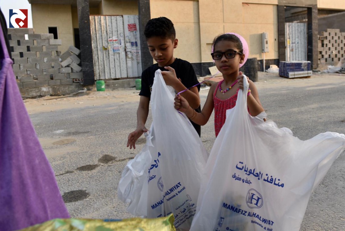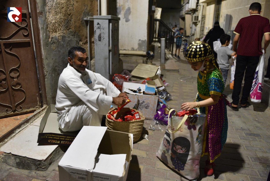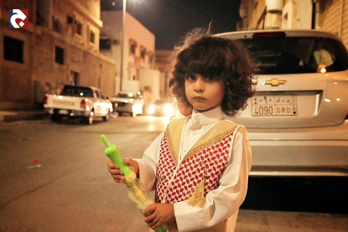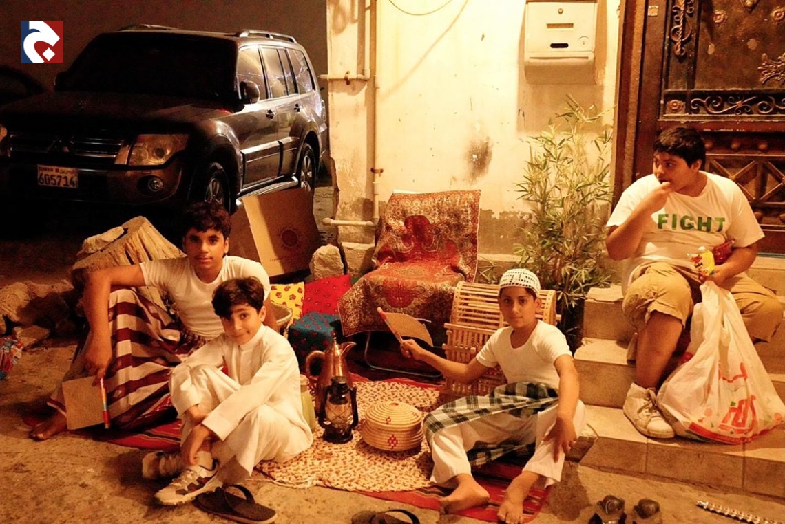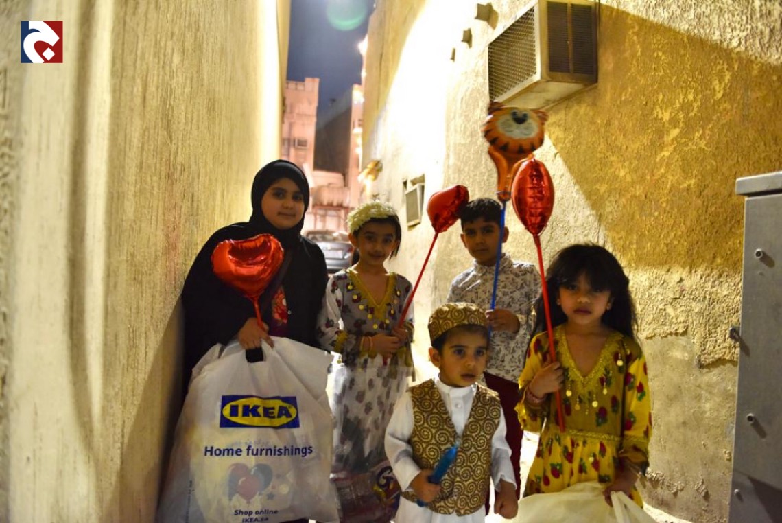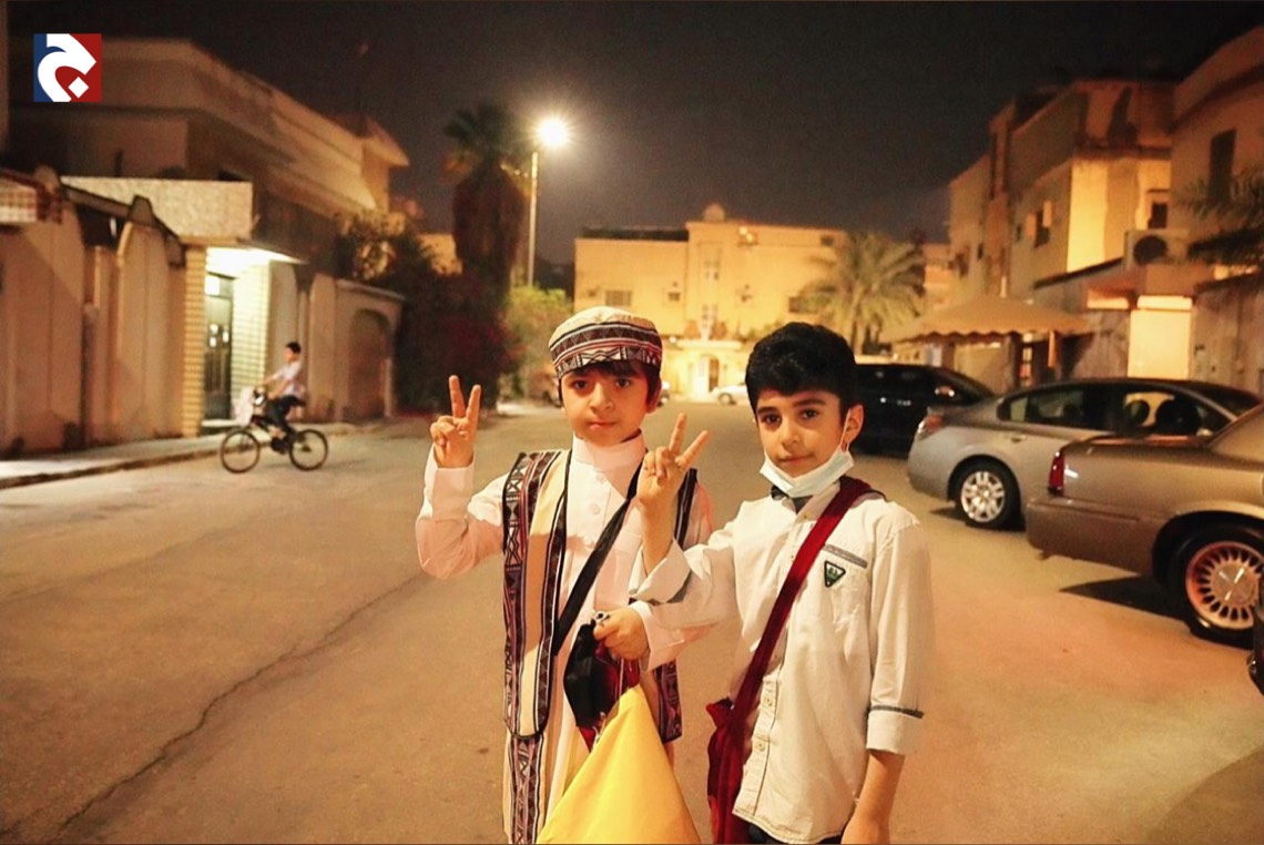 وانتشر الأطفال المتزينين بالثياب الخاصة بالقرقيعان وهم يحملون الأكياس مارين بمنازل الأقارب والجيران لجمع الهدايا والحلويات وهم يرددون بصوت مسموع ”ناصفة حلاوة اعطونا الله يعطيكم“.