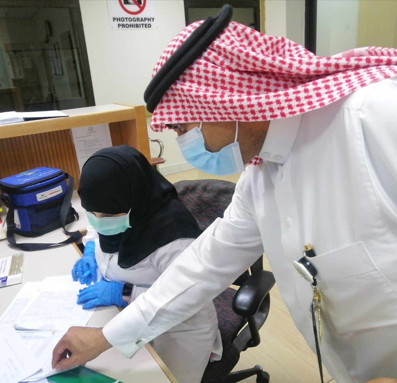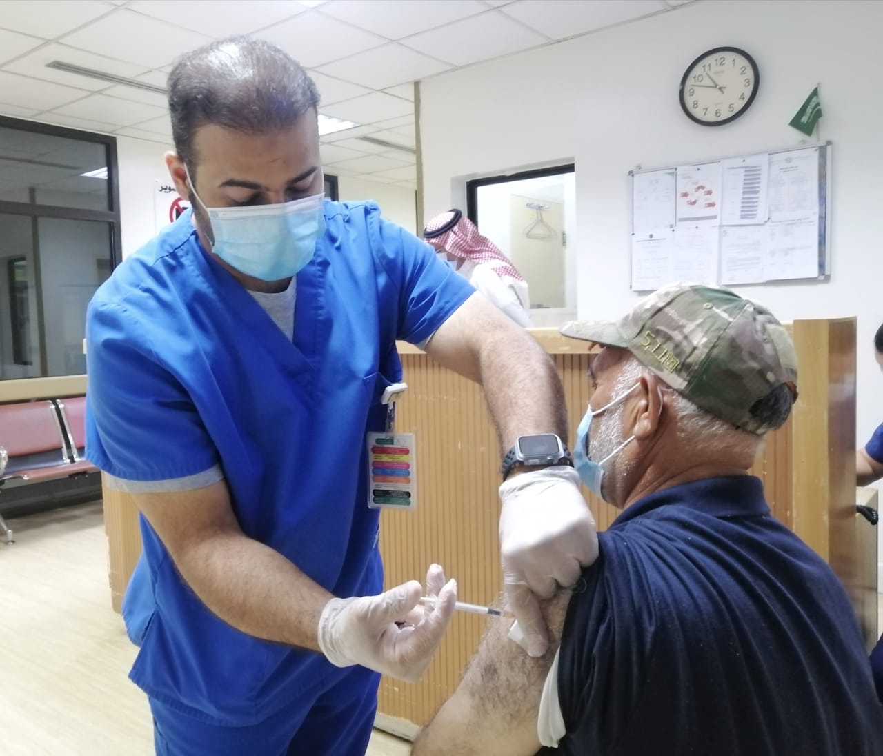 وأكمل الفريق المكون من رئيس قسم الطب المنزلي بمستشفى القطيف المركزي شوقي الصادق، والأخصائي الاجتماعي فاضل المخلوق، والممرضين جاسم أمان، وأحمد المخرق، ورمله المسحر، وزهراء السبع، ومدخل المعلومات والبيانات محمد الجارودي، إعطاء الجرعة الأولى من لقاح ”كورونا“.