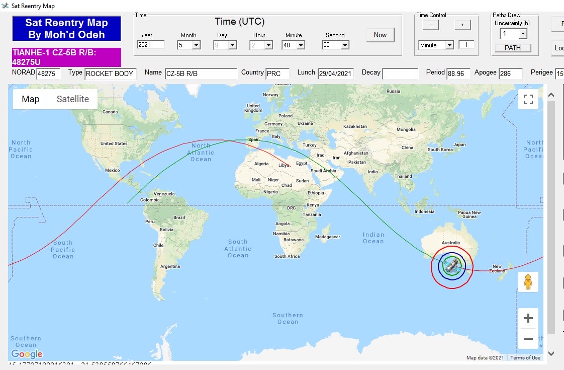 ونشر المركز خريطة تبين مكان السقوط المتوقع، وتبين الخطوط الخضراء والحمراء تبين الأماكن التي قد يسقط فوقها الحطام خلال هامش الخطأ.