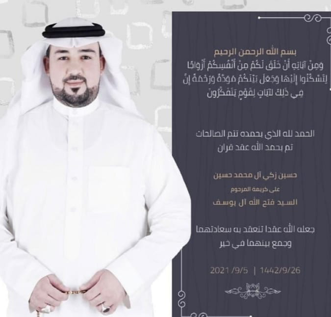 احتفلت عائلة آل محمد حسين وآل يوسف في تاروت مساء يوم الأربعاء بعقد قران الشاب حسين زكي آل محمد حسين على كريمة الحاج السيد فتح الله آل يوسف وسط فرحة الأهل والأصدقاء ومحبي العريسين.