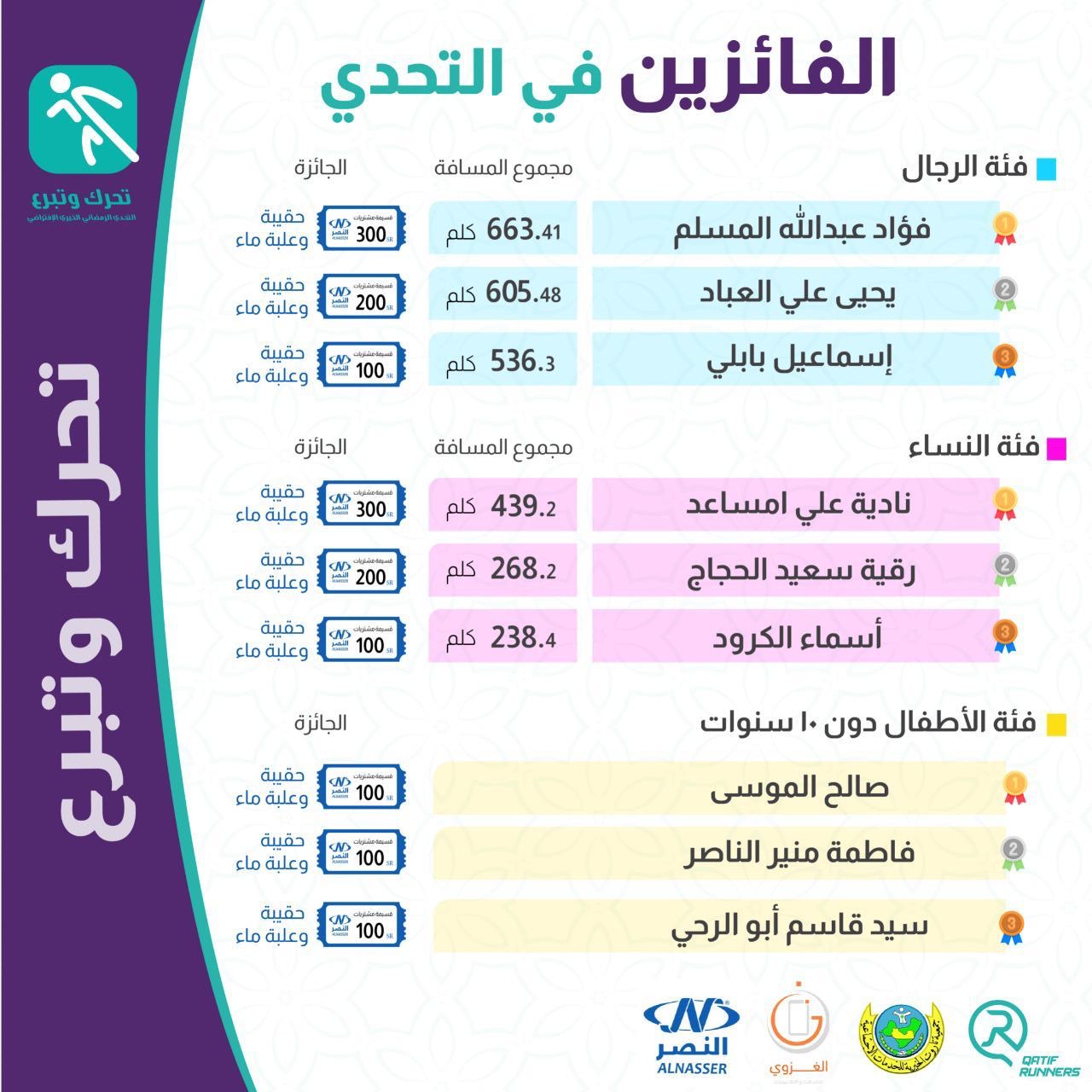 واضاف في ختام الفعالية وزعت مجموعة جوائز قيمة من الرعاة الكرام للفائزين من الرجال والسيدات والاطفال الذين قطعوا مسافات اطول، وتعددت الجوائز بين اجهزة جوال وساعات ذكية وكوبونات مشتريات وجوائز عينية، مضافا لشهادات الشكر الالكترونية التي قدمت لكافة المشاركين والمشاركات في ذات الفعالية.