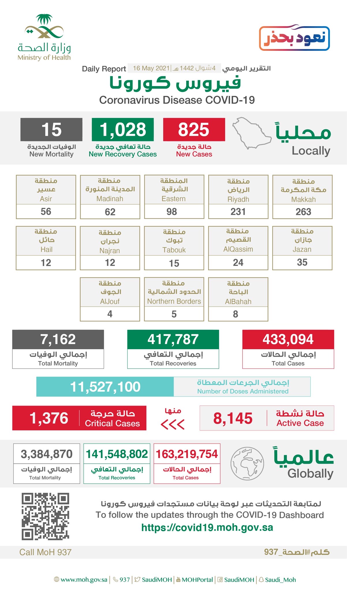 كما أعلنت الصحة عن تسجيل ”1028“ حالة تماثلت للشفاء، ليصل مجموع المتعافين إلى ”417787“ حالة تعافي، فيما ارتفع إجمالي الوفيات في المملكة إلى ”7162“ حالة بعد تسجيل ”15“ حالة وفاة جديدة.