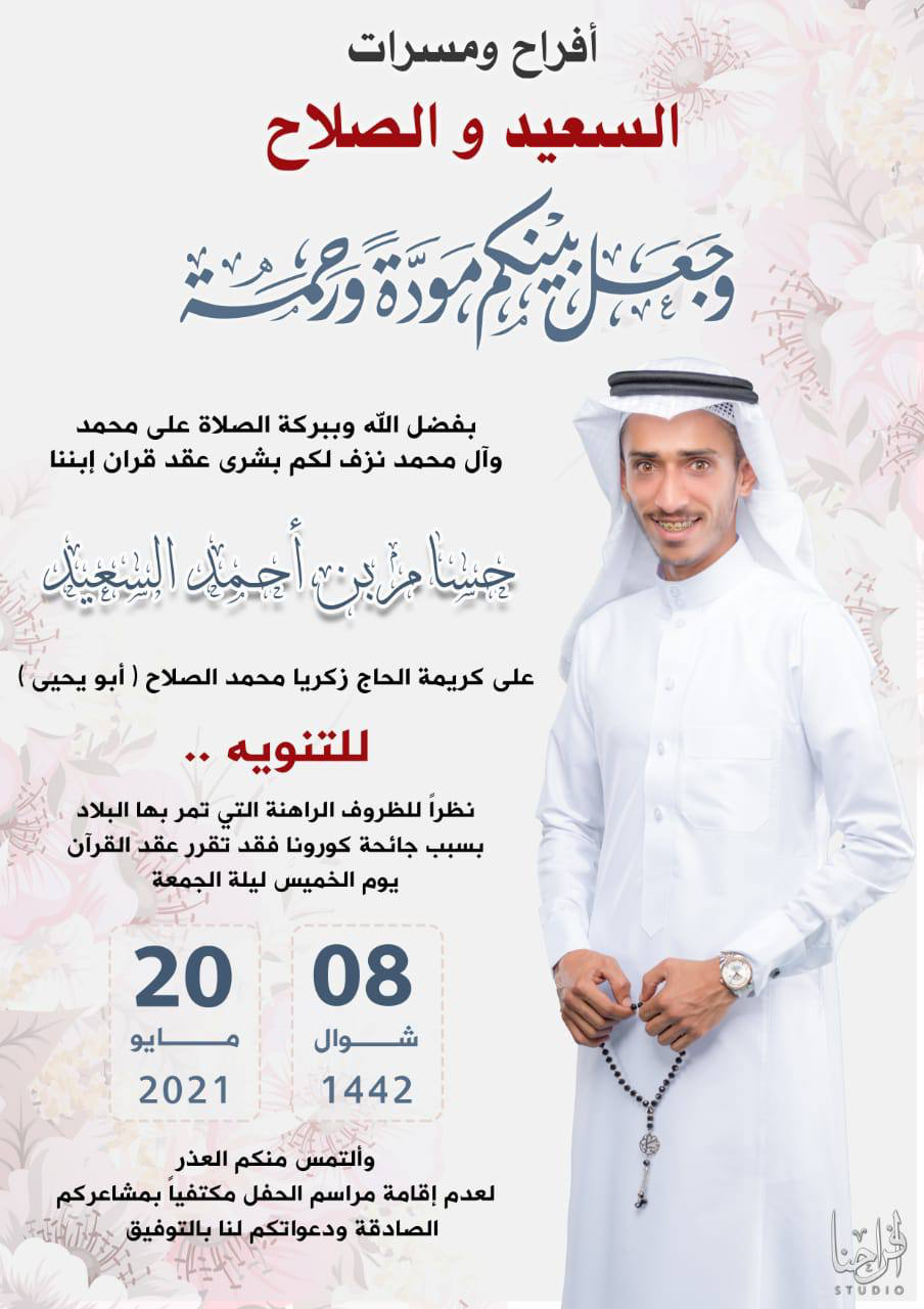 احتفلت عائلة السعيد والصلاح في صفوى مساء يوم الخميس بعقد قران الشاب حسام أحمد السعيد على كريمة الحاج زكريا محمد الصلاح«أبو يحيى» وسط فرحة الأهل والأصدقاء ومحبي العريسين.