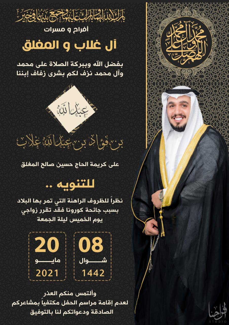 احتفلت عائلة آل غلاب والمغلق في صفوى مساء يوم الخميس بزفاف الشاب عبدالله فؤاد عبدالله آل غلاب على كريمة الحاج حسين صالح المغلق وسط فرحة الأهل والأصدقاء ومحبي العريسين.