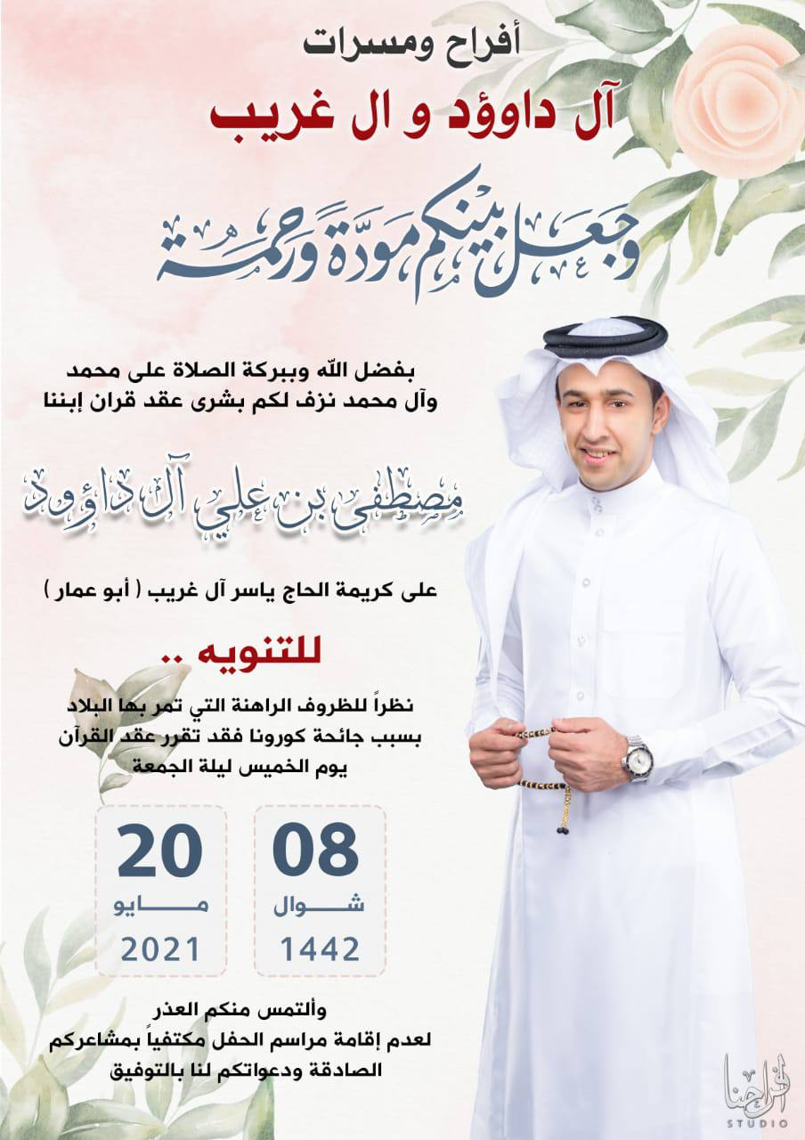 احتفلت عائلة آل داؤود وآل غريب في صفوى مساء يوم الخميس بعقد قران الشاب مصطفى علي آل داؤود على كريمة الحاج ياسر آل غريب «أبو عمار» وسط فرحة الأهل والأصدقاء ومحبي العريسين.