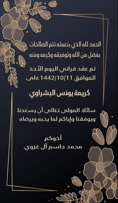 احتفلت عائلة الغزوي والبشراوي في القديح مساء يوم الأحد بعقد قران الشاب محمد جاسم الغزوي على كريمة الحاج يونس البشراوي وسط فرحة الأهل والأصدقاء ومحبي العريسين.