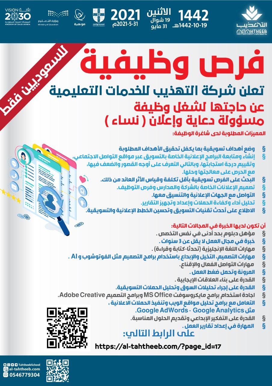 تعلن شركة التهذيب للخدمات التعليمية عن حاجتها لتوظيف: