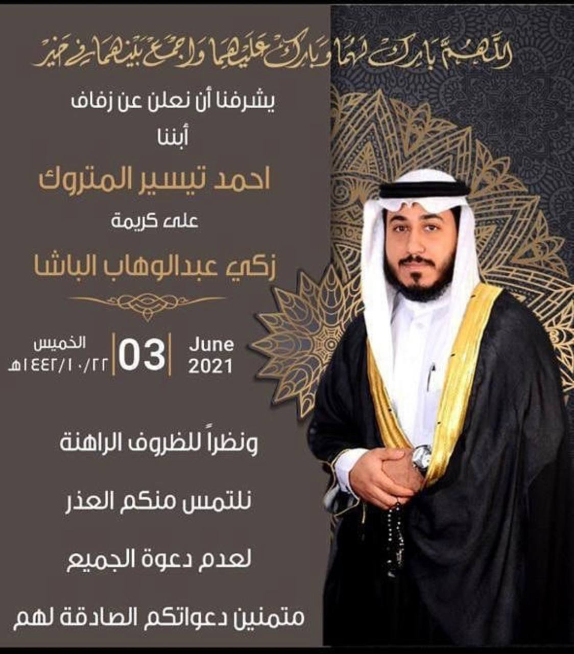تحتفل عائلة المتروك والباشا في سيهات مساء يوم الخميس بزفاف الشاب أحمد تيسير المتروك على كريمة الحاج زكي عبد الوهاب الباشا وسط فرحة الأهل والأصدقاء ومحبي العريسين.