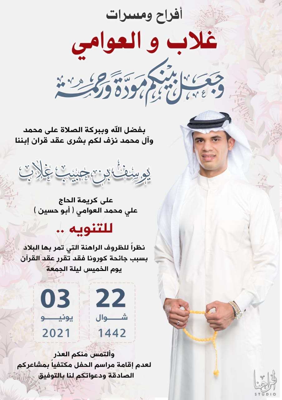 تحتفل عائلة غلاب والعوامي في صفوى مساء يوم الخميس بعقد قران الشاب يوسف حبيب غلاب على كريمة الحاج علي محمد العوامي «أبو حسين» وسط فرحة الأهل والأصدقاء ومحبي العريسين.