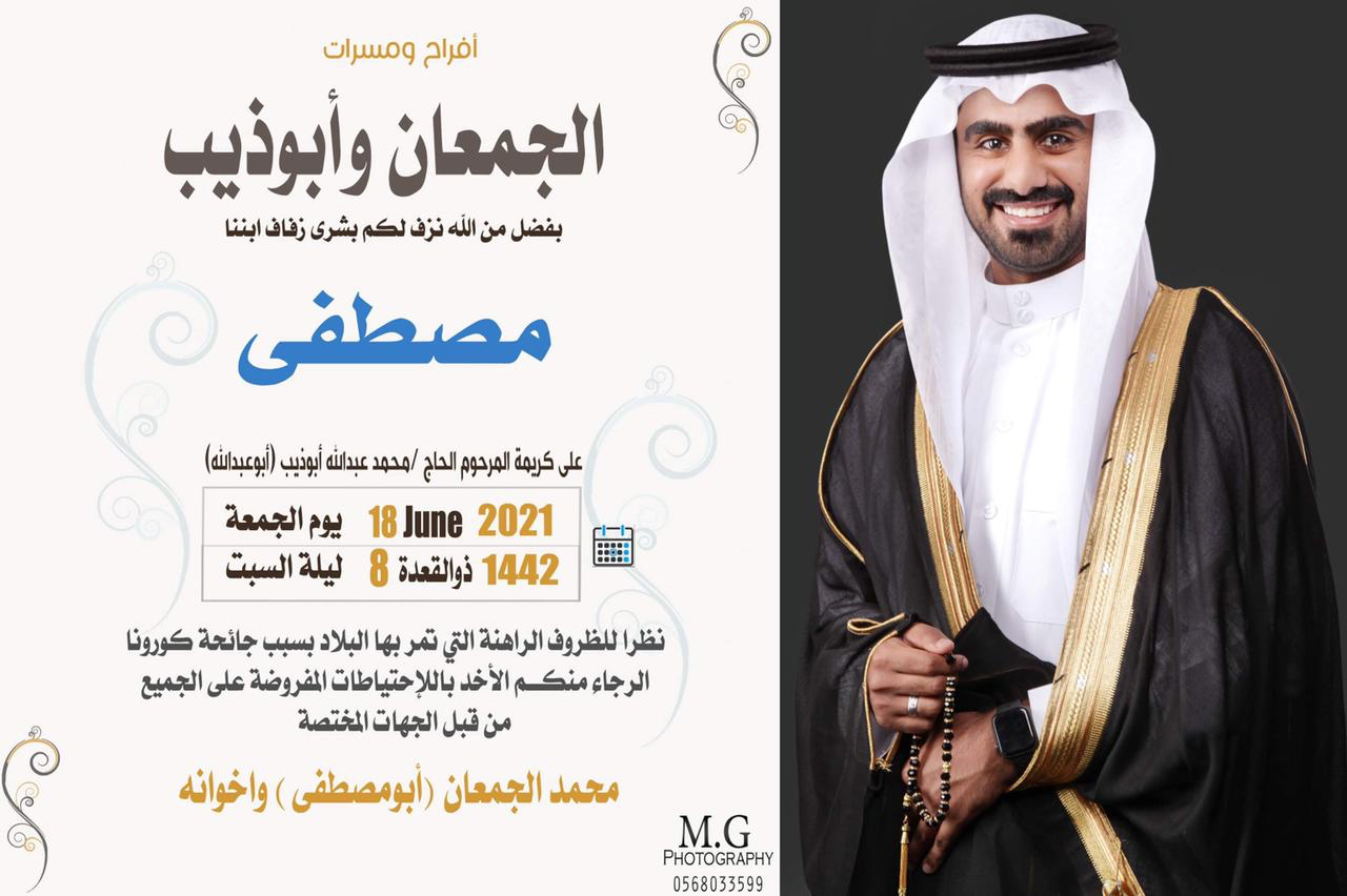 تحتفل عائلة الجمعان وأبو ذيب في تاروت مساء يوم الجمعة بزفاف الشاب مصطفى محمد عبد الكريم الجمعان على كريمة الحاج محمد عبدالله أبو ذيب «أبو عبدالله» وسط فرحة الأهل والأصدقاء ومحبي العريسين.