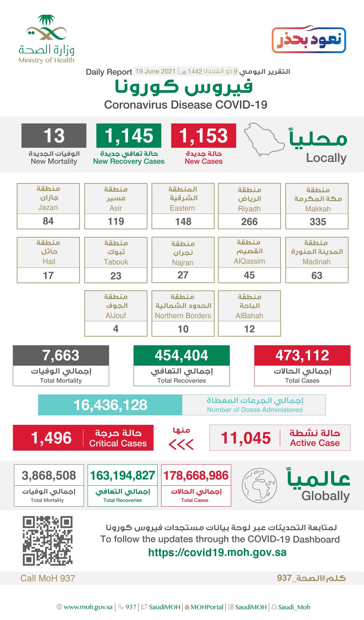 وتتيح وزارة الصحة الاطلاع على مستجدات الفايروس في المملكة، وذلك بنشر إحصاءاتها اليومية على الموقع الإلكتروني https://covid19.moh.gov.sa.