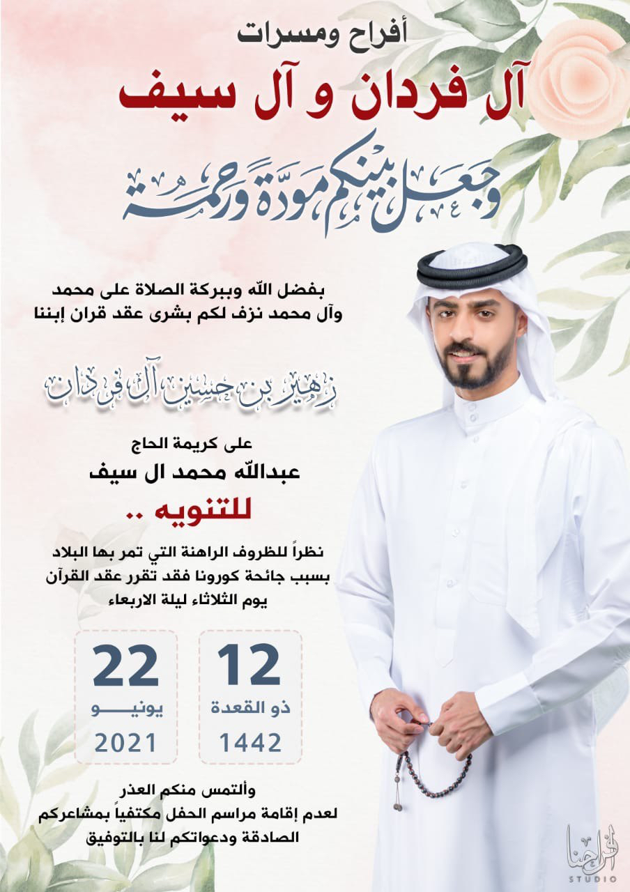 احتفلت عائلة آل فردان وآل سيف في صفوى مساء يوم الثلاثاء بعقد قران الشاب زهير حسين آل فردان على كريمة الحاج عبدالله محمد آل سيف وسط فرحة الأهل والأصدقاء ومحبي العريسين.