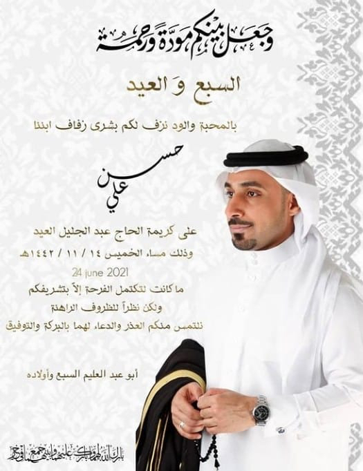 تحتفل عائلة السبع والعيد في سيهات مساء يوم الخميس بزفاف الشاب حسن علي السبع على كريمة الحاج عبد الجليل العيد وسط فرحة الأهل والأصدقاء ومحبي العريسين.