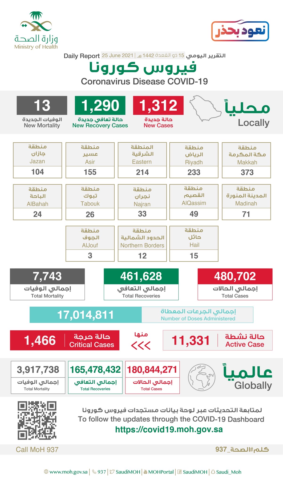 كما أعلنت الصحة عن تسجيل ”1290“ حالة تماثلت للشفاء، ليصل مجموع المتعافين إلى ”461628“ حالة تعافي، فيما ارتفع إجمالي الوفيات في المملكة إلى 7743 حالة بعد تسجيل ”13“ حالة وفاة جديدة.