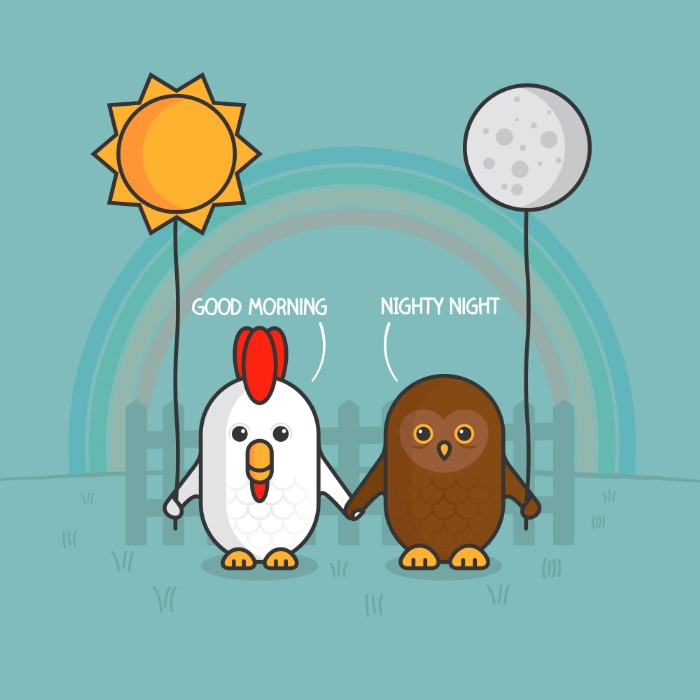 يُعتقد أن أحد الأمثلة النموذجية للشخص الصباحي هو الذي يستيقظ بشكل طبيعي في الساعة 6 صباحًا، ويذهب لممارسة رياضة الجري، والاستحمام، ويتناول وجبة الإفطار، ويكون جاهزًا ليوم عمل مثمر بحلول الساعة 9 صباحًا. بينما يجد الشخص المسائي «الليلي» صعوبة للاستيقاظ في الصباح ويشعر بأنه أكثر إنتاجية في المساء / الليل.
