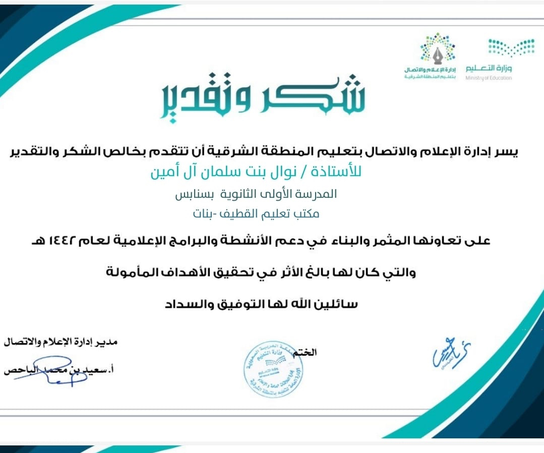 كرمت ادارة الإعلام والاتصال بتعليم المنطقة الشرقية المعلمة بالثانوية الأولى بسنابس الاستاذة نوال سلمان منصور آل أمين بشهادة شكر وتقدير نظير دعمها الأنشطة والبرامج الإعلامية لعام 1442.