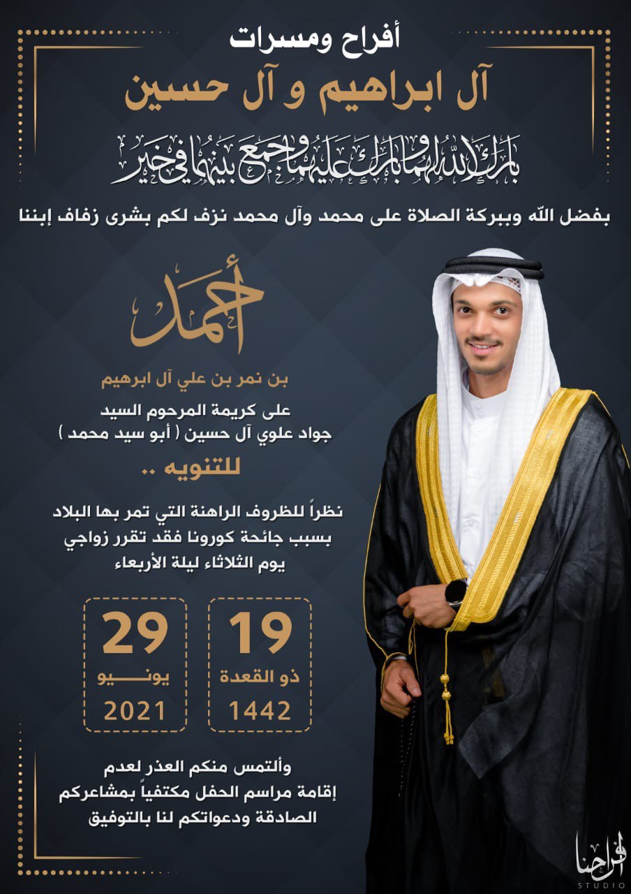 احتفلت عائلة آل ابراهيم وآل حسين في صفوى مساء يوم الثلاثاء بزفاف الشاب أحمد نمر علي آل ابراهيم على كريمة المرحوم السيد جواد السيد علوي آل حسين «أبو السيد محمد» وسط فرحة الأهل والأصدقاء ومحبي العريسين.