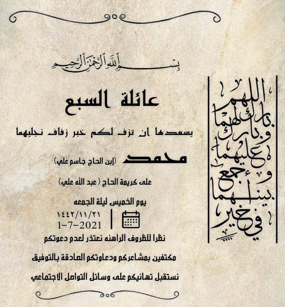 تحتفل عائلة السبع في سيهات مساء يوم الخميس بزفاف الشاب محمد جاسم علي السبع على كريمة الحاج عبدالله علي السبع وسط فرحة الأهل والأصدقاء ومحبي العريسين.