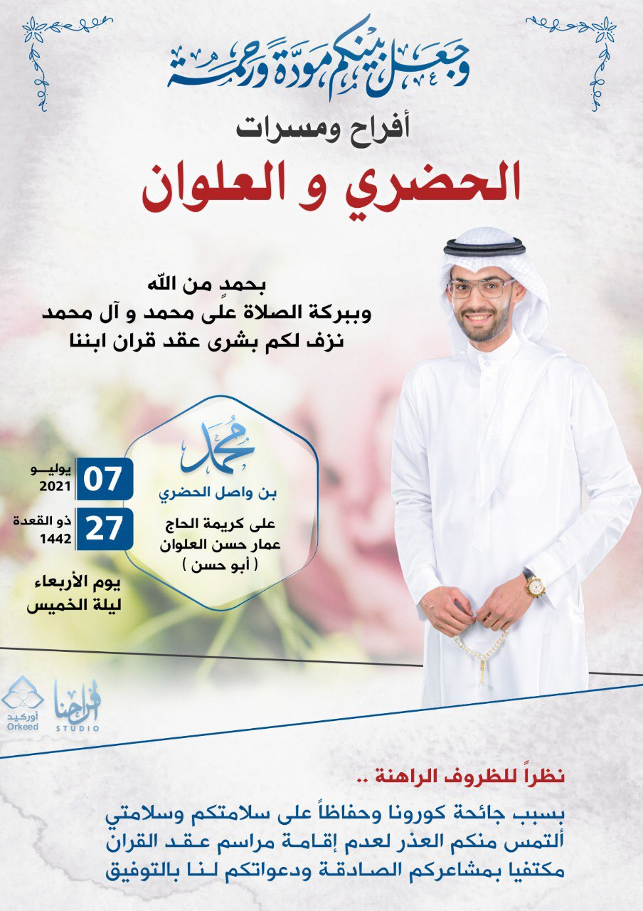 احتفلت عائلة الحضري والعلوان في صفوى مساء يوم الأربعاء بعقد قران الشاب محمد واصل الحضري على كريمة الحاج عمار حسن العلوان «أبو حسن» وسط فرحة الأهل والأصدقاء ومحبي العريسين.