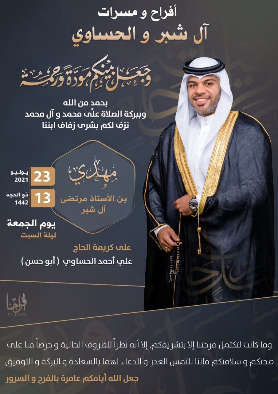 احتفلت عائلة آل شبر والحساوي في صفوى مساء يوم الجمعة بزفاف الشاب مهدي مرتضى آل شبر على كريمة الحاج علي أحمد الحساوي «أبو حسن» وسط فرحة الأهل والأصدقاء ومحبي العريسين.