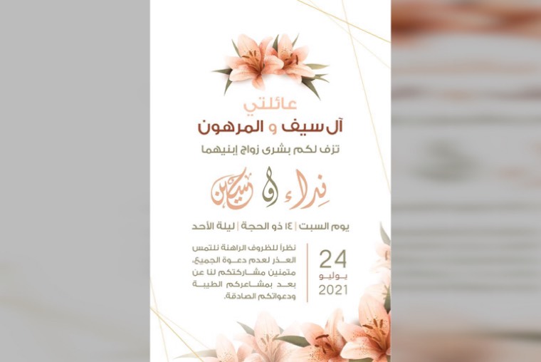 احتفلت عائلة المرهون وآل سيف مساء السبت بزفاف الشاب حسين المرهون على الشابة نداء محمد السيف، الكاتبة الصحفية بصحيفة جهينة الإخبارية وسط فرحة الأهل والأصدقاء ومحبي العريسين.