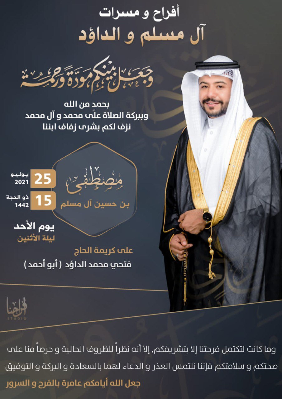 احتفلت عائلة آل مسلم والداؤد في صفوى مساء يوم الأحد بزفاف الشاب مصطفى حسين آل مسلم على كريمة الحاج فتحي محمد الداؤد «أبو أحمد» وسط فرحة الأهل والأصدقاء ومحبي العريسين.