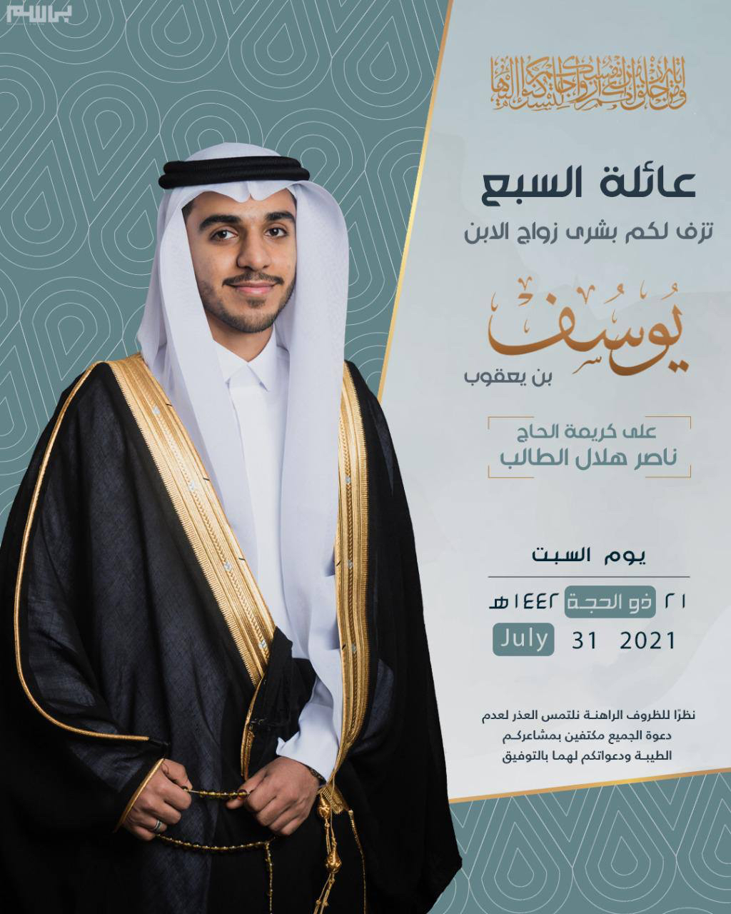 تحتفل عائلة السبع والطالب في سيهات مساء يوم السبت بزفاف الشاب يوسف يعقوب السبع على كريمة الحاج ناصر هلال الطالب وسط فرحة الأهل والأصدقاء ومحبي العريسين.
