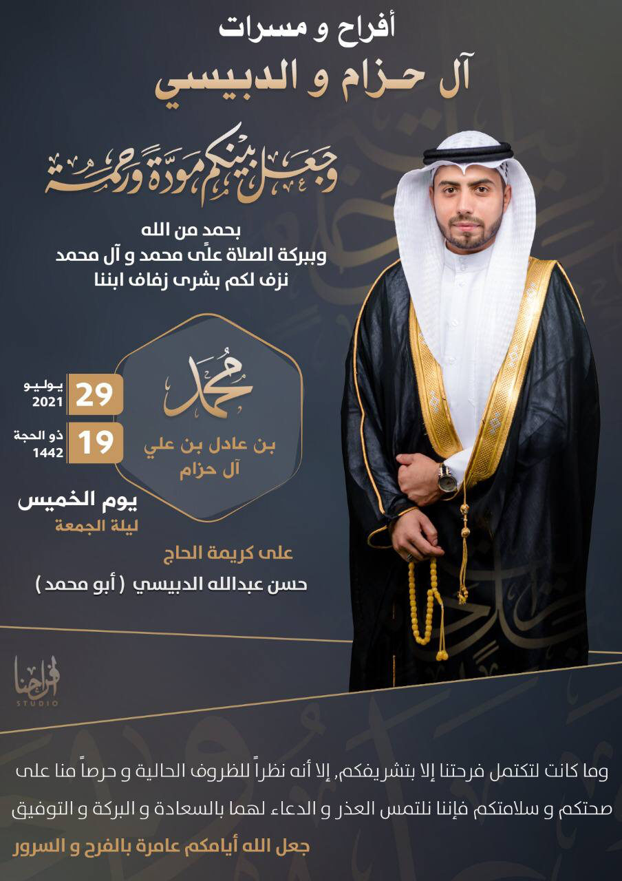 احتفلت عائلة آل حزام والدبيسي في صفوى مساء يوم الخميس بزفاف الشاب محمد عادل علي آل حزام على كريمة الحاج حسن عبدالله الدبيسي «أبو محمد» وسط فرحة الأهل والأصدقاء ومحبي العريسين.