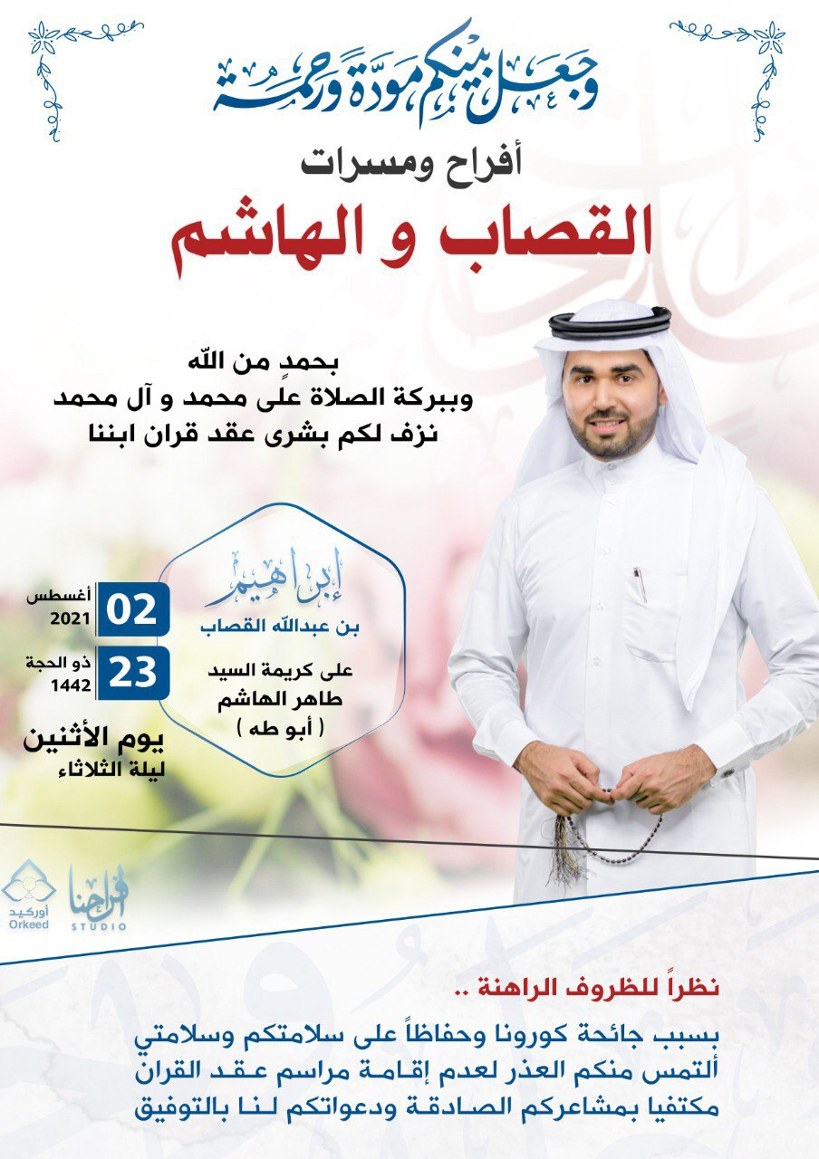 احتفلت عائلة القصاب والهاشم في صفوى مساء يوم الإثنين بعقد قران الشاب ابراهيم عبدالله القصاب على كريمة الحاج السيد طاهر الهاشم «أبو طه» وسط فرحة الأهل والأصدقاء ومحبي العريسين.