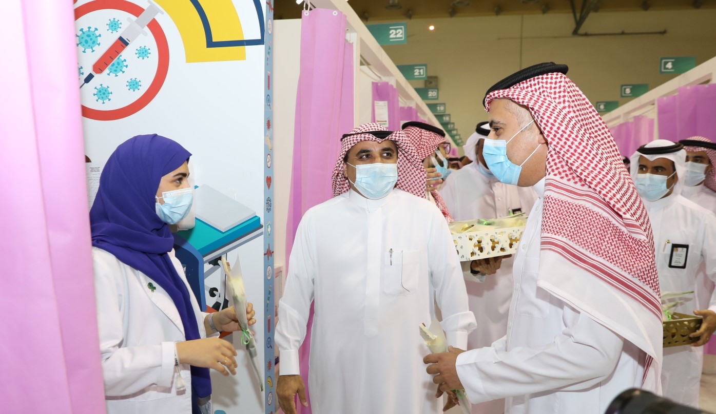وسط اصطفاف المستفيدين حين دخولهم الغرف المخصصة لتلقي لقاح فيروس ”كورونا“، في مركز اللقاحات بمدينة الأمير عبدالله بن جلوي الرياضية، الذي يشهد إقبال واسع من المواطنين والمقيمين رغبةً في حصولهم على ”التحصين“، قُرعت الدفوف والطبول لتدوي القاعة بالأهازيج الوطنية التي قادتها فرقة العرضة السعودية، احتفالاً بأبطال الصحة.