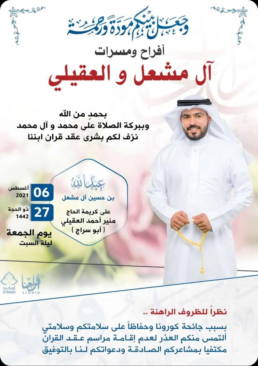 احتفلت عائلة آل مشعل والعقيلي في صفوى مساء يوم الجمعة بعقد قران الشاب عبدالله حسين آل مشعل على كريمة الحاج منير أحمد العقيلي وسط فرحة الأهل والأصدقاء ومحبي العريسين.