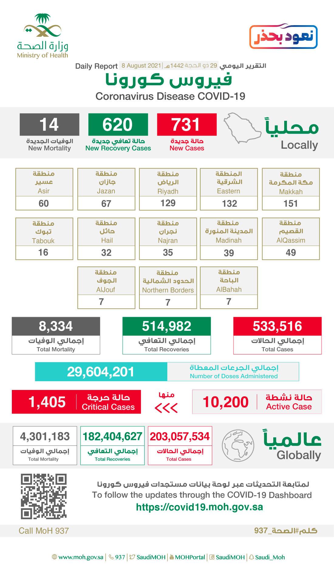 كما أعلنت الصحة عن تسجيل ”620“ حالة تماثلت للشفاء، ليصل مجموع المتعافين إلى ”514982“ حالة تعافي، فيما ارتفع إجمالي الوفيات في المملكة إلى ”8334“ حالة بعد تسجيل ”14“ حالة وفاة جديدة.