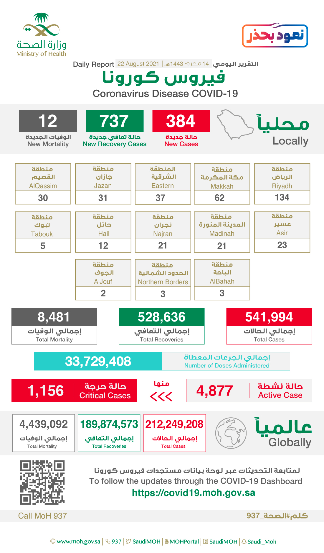 وتتيح وزارة الصحة الاطلاع على مستجدات الفايروس في المملكة، وذلك بنشر إحصاءاتها اليومية على الموقع الإلكتروني https://covid19.moh.gov.sa.