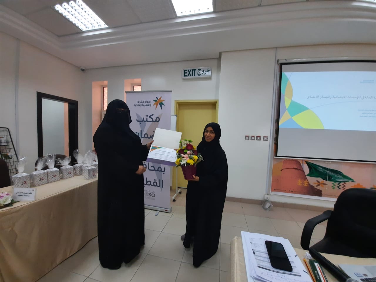 وأختتم اللقاء بتقديم شهادات الشكر والتقدير للمدربة وللحضور من قبل رئيسة القسم النسائي لمكتب الضمان الإجتماعي بمحافظة القطيف سمية عبد الوهاب.