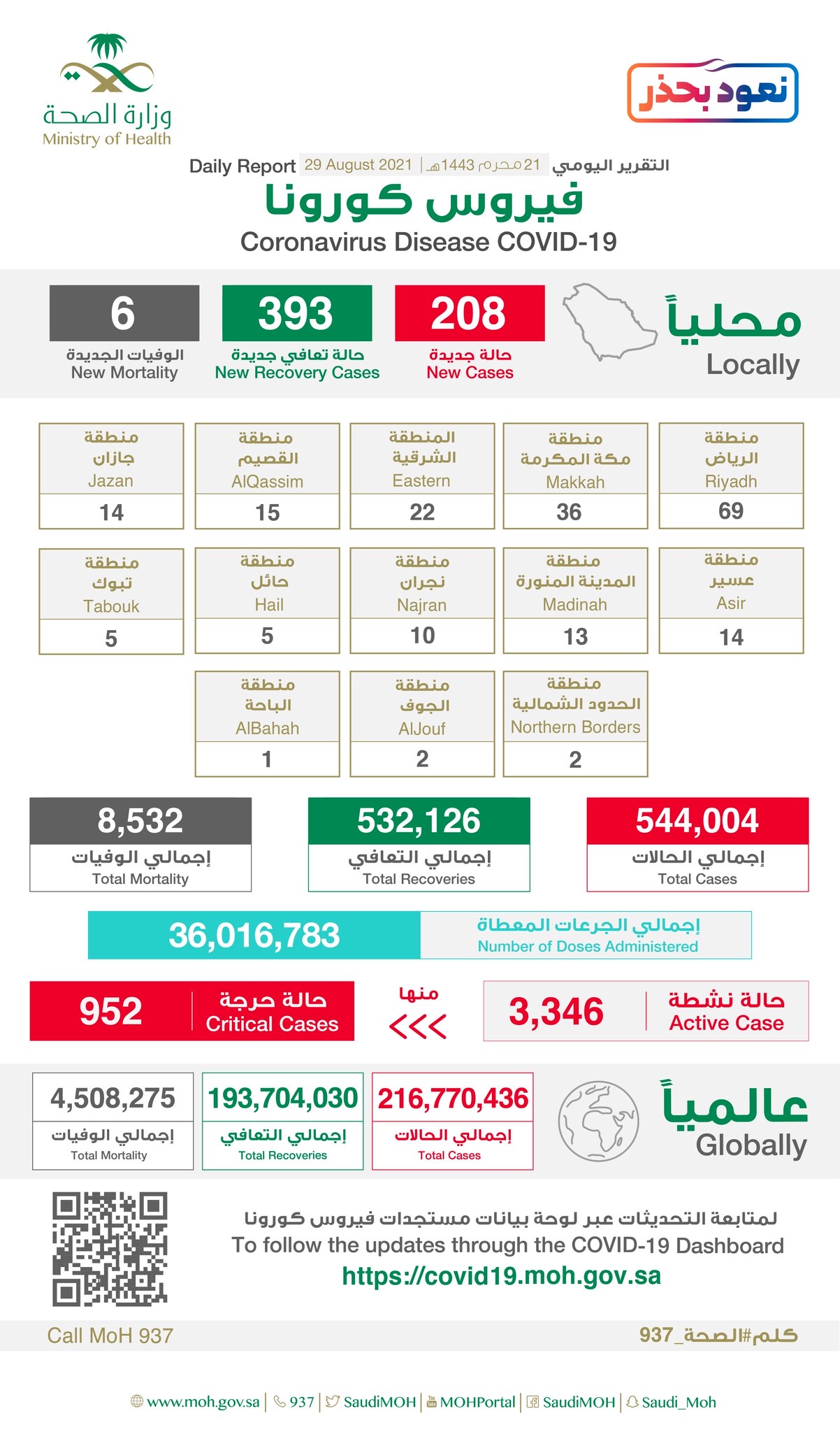 كما أعلنت الصحة عن تسجيل ”393“ حالة تماثلت للشفاء، ليصل مجموع المتعافين إلى ”532126“ حالة تعافي، فيما ارتفع إجمالي الوفيات في المملكة إلى ”8532“ حالة بعد تسجيل ”6“ حالة وفاة جديدة.