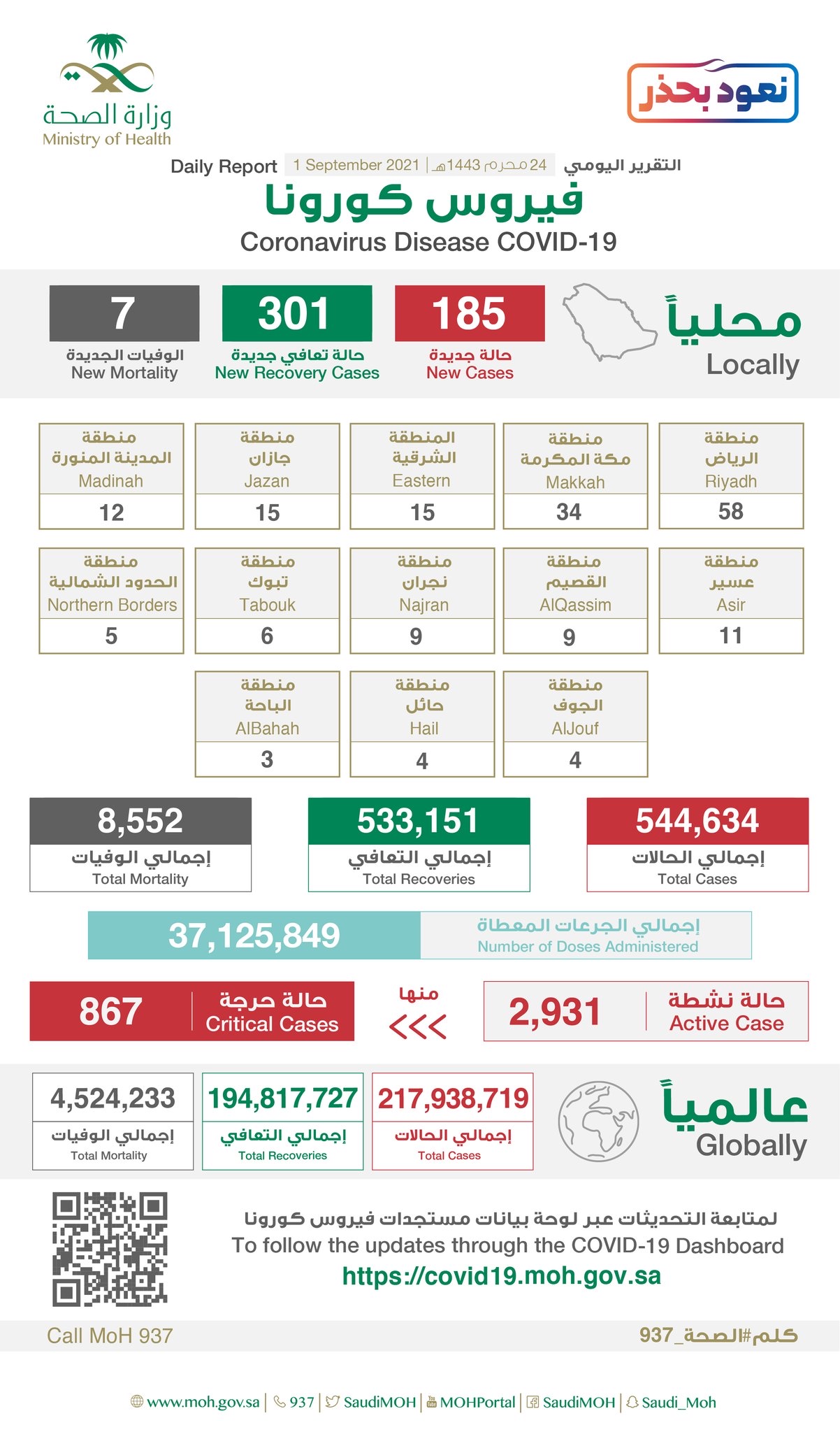 الصحة تسجل «185» إصابة جديدة بكورونا.. منها ”1“ في القطيف
