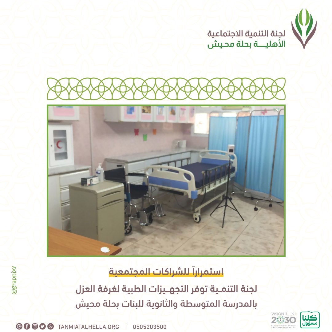 وفرت لجنة التنمية بحلة محيش، التجهيزات الطبية لغرفة العزل بالمدرسة المتوسطة والثانوية للبنات بحلة محيش، وهي ”سرير طبي - خزانة - صيدلية - كرسي متحرك - جهاز قياس حرارة مع ستاند - حاجز طبي متحرك“.
