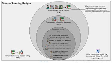 مخطط ڤين Venn يوضح التسلسل الهرمي لتصميمات التعلم عن طريق الفشل المثمر PF وحل المسائل متبوعًا بالشرح PS-I ا والتحضير للتعلم الفي للمستقبل PFL. هنا، نعرض فئة واحدة من تصميمات التحضير للتعلم في المستقبل «PFL» حيث تسبق ممارسات التعقل «اعطاء المعنى sensmaking، انظر 5» تسبق الشرح. ومع ذلك، على نطاق أوسع، يمكن تصور PFL على أنه أي تجربة تعد الطلاب للتعلم في المستقبل - يمكن أن يحدث التعلم ليس فقط من خلال الشرح الصريح explicit ولكن أيضًا من خلال الاستكشاف والممارسة وما إلى ذلك. PF = الفشل المثمر؛ PS-I = حل المسائل متبوعًا بالشرح. المصدر: DOI: 10,3102/00346543211019105